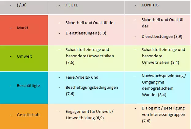 Eine hohe Bewertung erhielten insgesamt die Themen in den Bereichen Markt und Beschäftigte. Den Umweltthemen wird ein hoher Bedeutungsgewinn prognostiziert, wohingegen der Bereich Gesellschaft insgesamt niedrig bewertet wurde. Die Bereiche Markt und Beschäftigte wurden in der Summe von den internen Stakeholdern höher als von den externen bewertet. Dem gegenüber wurden Themen aus den Bereichen Umwelt und Gesellschaft von den externen Stakeholdern im Vergleich höher bewertet. Insbesondere im Bereich Umwelt zeigt sich eine unterschiedliche Einschätzung aus interner und externer Sicht.