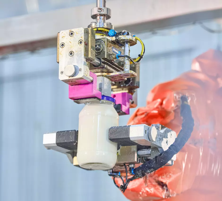 In der Lebensmittelindustrie kommt es immer wieder zu Fehlchargen von Produkten in Glasbehältern. Der Roboter „SPEED“ ermöglicht die Trennung von Behälter und Inhalt und damit das Recycling der Verpackung sowie die energetische Verwertung der Lebensmittel.